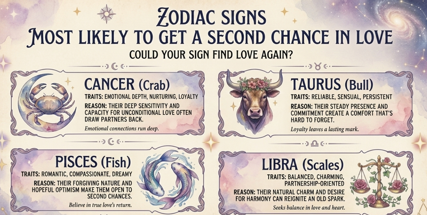 Love isn’t that easy for everyone. For some, it might be red roses and happily ever after, but for many, it is heartbreaks, sleepless nights, and haunting memories. But astrologers believe that certain zodiac signs are more likely to get second chances in love. Check out whether you are in the list.